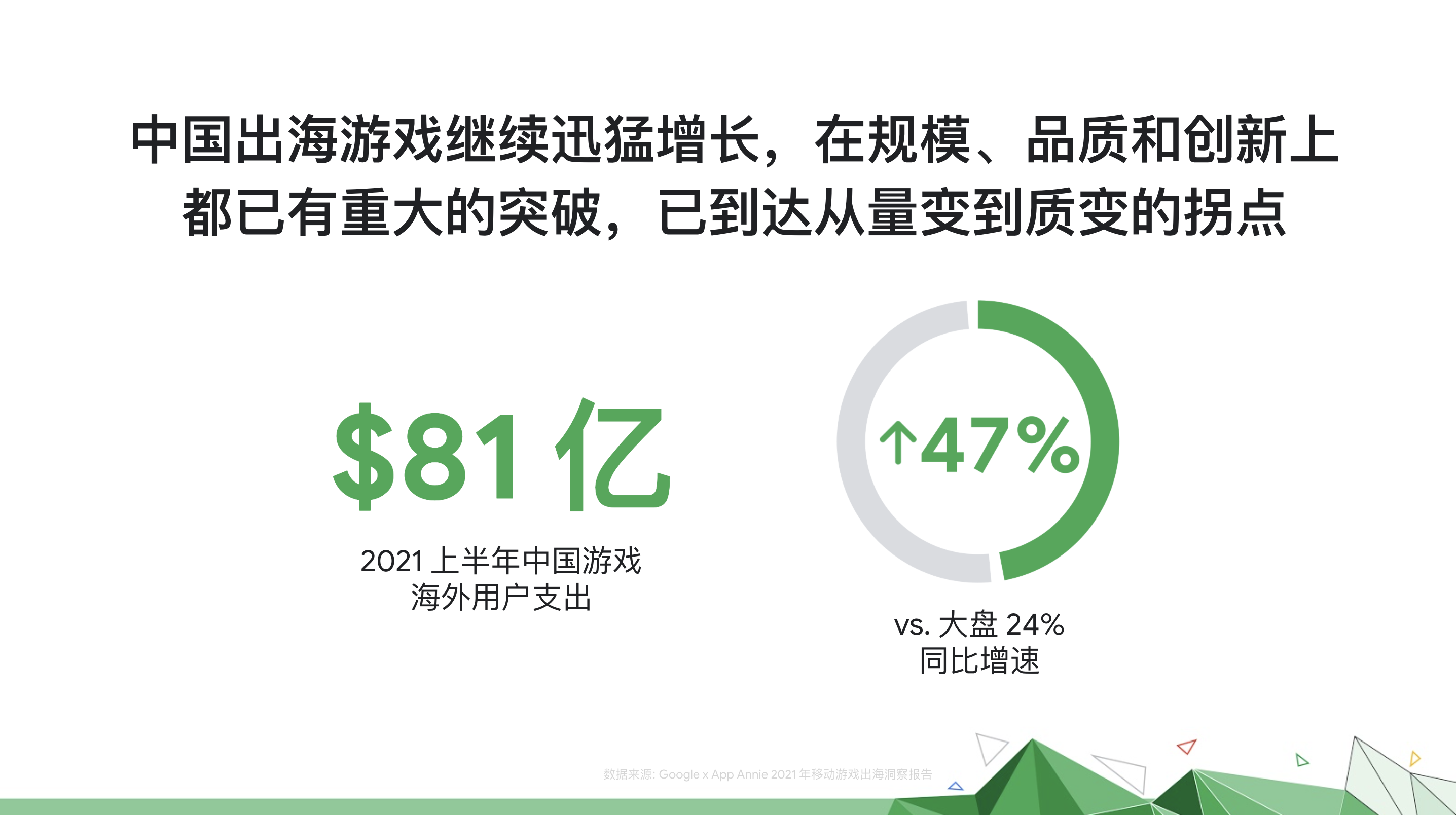 Google联合App Annie发布的数据显现,2021年上半年,我国出海手游在海外商场取得了81亿美元收入,增速到达47%,挨近海外全体游戏大盘增速(24%)的两倍。另一方面,在此期间,我国手游厂商在海外游戏商场比例占比到达23.4%,规划成为成为全球榜首。